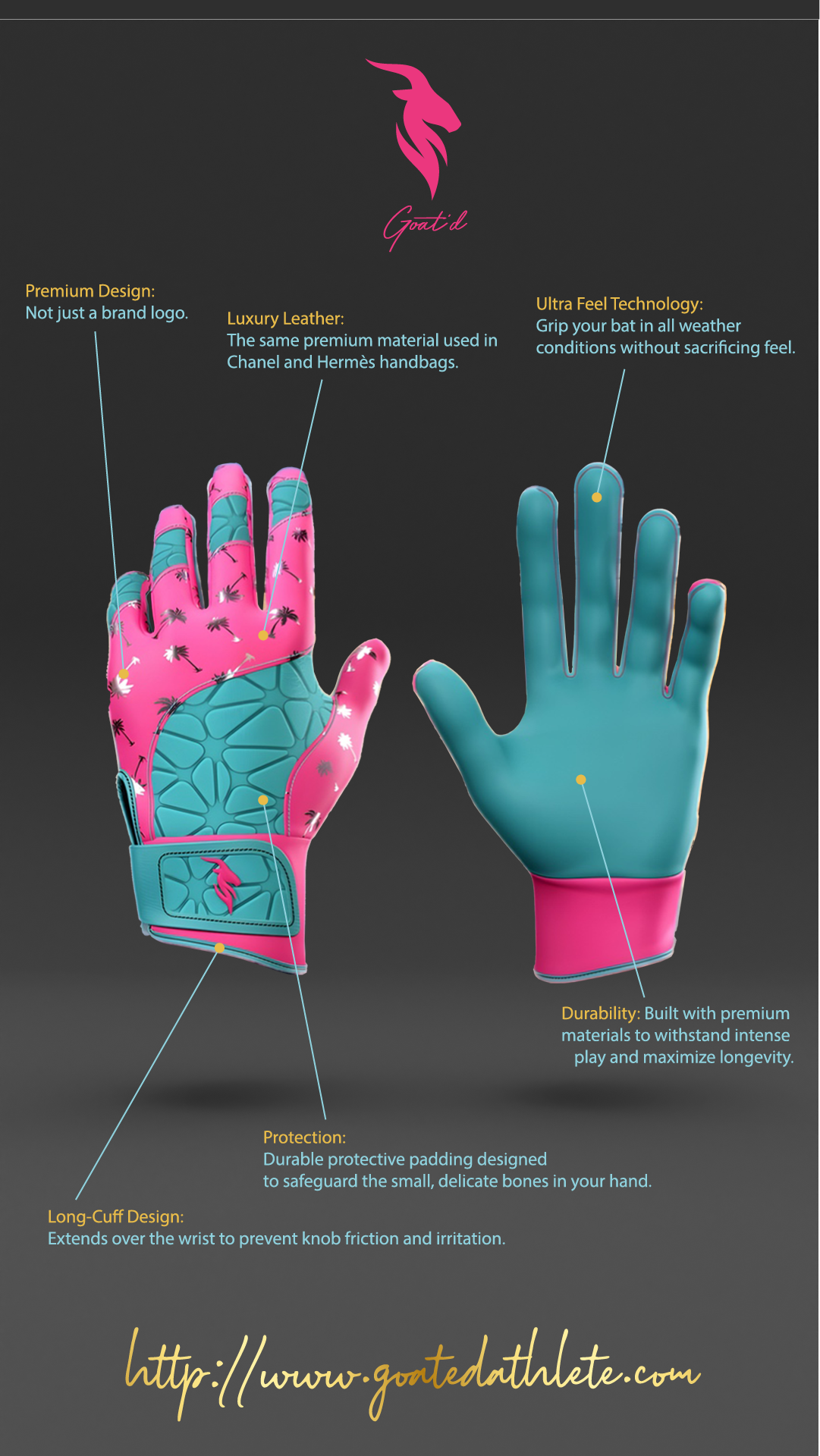 - Luxury Leather. Crafted with the same leather used in the most exclusive handbags in the world, our batting gloves offer unparalleled quality, elegance, and performance. Whether it’s scorching hot, bitterly cold, or pouring rain, these gloves are built to perform in any condition. Excuses? They’re officially off the table.