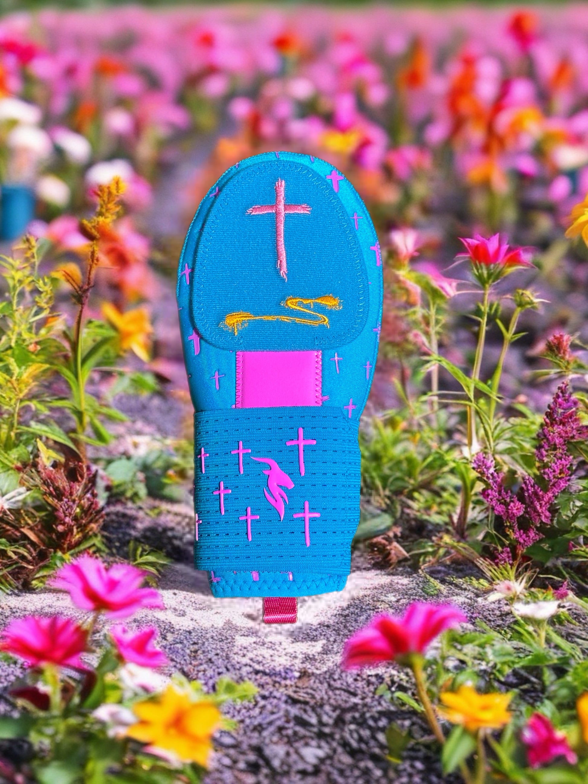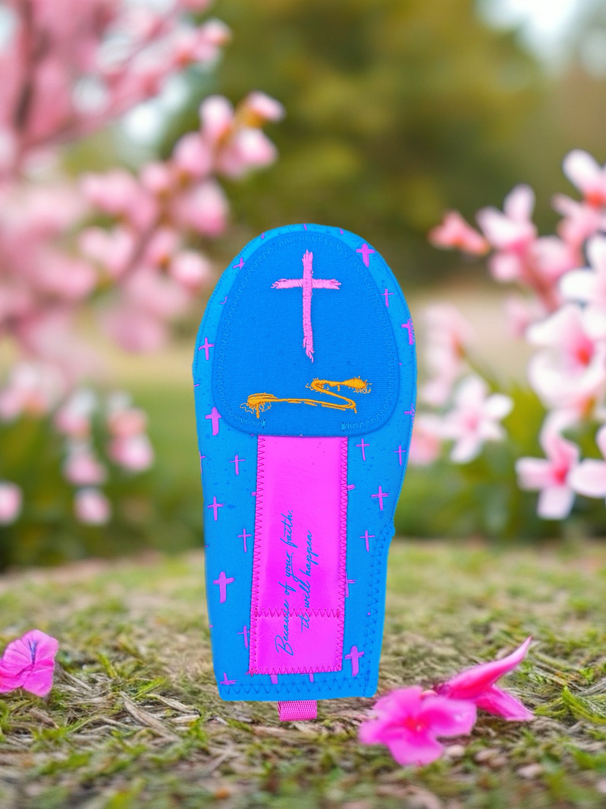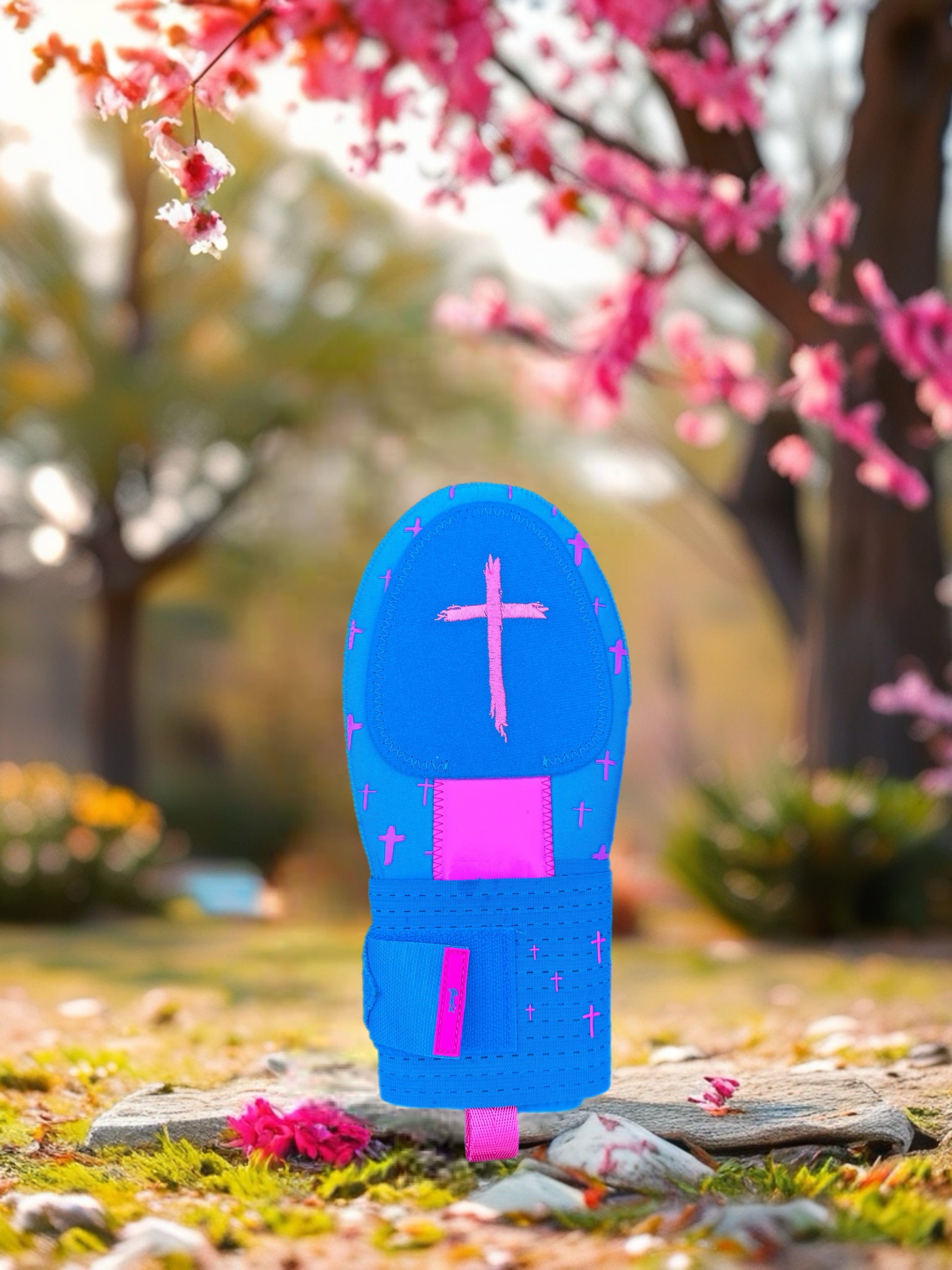 Blueberry. A bright neon blue mitt with neon pink accents, marked with Matthew 9:29 on the front and back, “Because of your faith, it will happen.”