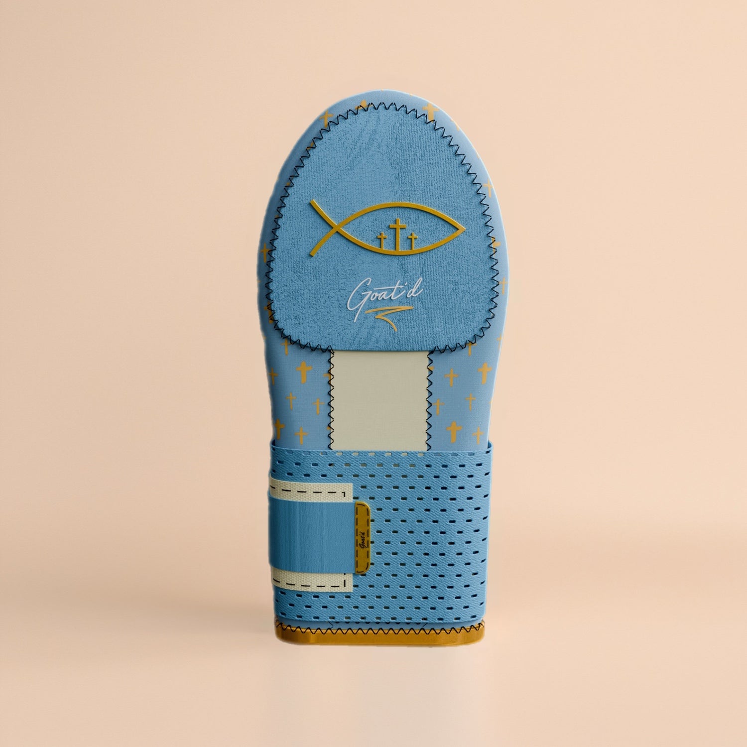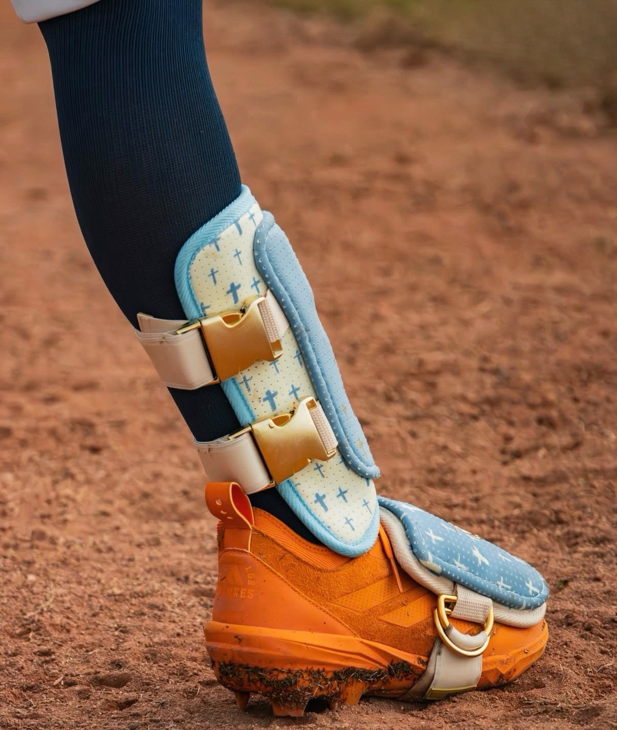 Psalm 23 Leg Guard — Full-shin and ankle coverage with clean baby-blue/cream detailing.